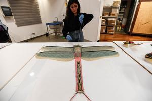 (250529) — SANTIAGO, 29 mayo, 2025 (Xinhua) — Imagen del 27 de mayo de 2025 de la encargada de Colecciones del Museo de Arte Popular Americano (MAPA) Tomás Lago de Chile, Paula Cabrera, mostrando una pieza durante una exposición de la colección de objetos chinos exhibidos en el MAPA, en Santiago, capital de Chile. El MAPA se ubica en la actualidad en la plataforma cultural del Campus Juan Gómez Millas de la Universidad de Chile, en la capital, donde trabajan la conservación, restauración e investigación de las 8.000 piezas que poseen, de las cuales unas 500 son chinas. (Xinhua/Jorge Villegas) (jv) (jg) (ah) (ce)