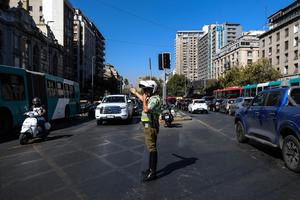 (250225) -- SANTIAGO, 25 febrero, 2025 (Xinhua) -- Un miembro de Carabineros de Chile dirige el tránsito durante un corte masivo de energía, en Santiago, capital de Chile, el 25 de febrero de 2025. Un corte masivo de energía afecta el martes a Chile, de norte a sur, debido a una falla en el sistema eléctrico del país sudamericano por causas desconocidas, informó el Coordinador Eléctrico Nacional, que opera entre Arica (norte) y Chiloé (sur). (Xinhua/Jorge Villegas) (jv) (jg) (ra) (vf)