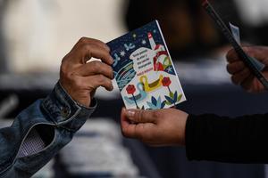 (250423) -- SANTIAGO, 23 abril, 2025 (Xinhua) -- Una persona recibe un ejemplar gratuito del libro "Veinte poemas de amor y una canción desesperada" del poeta chileno, Pablo Neruda, durante la actividad "Libros Libres" con motivo del Día Internacional del Libro y del Derecho de Autor, en Santiago, capital de Chile, el 23 de abril de 2025. (Xinhua/Jorge Villegas) (jv) (ah) (ra) (ce)