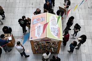 (260427) -- SANTIAGO, 27 abril, 2026 (Xinhua) -- Imagen del 25 de abril de 2026 de personas asistiendo a la tercera edición de la Fiesta de la Lectura en el marco del Día Internacional del Libro en el Centro Cultural La Moneda, en Santiago, capital de Chile. En el emblemático Cerro Santa Lucía o el imponente subterráneo del palacio Presidencial devenido en centro cultural, Chile celebró el Día Internacional del Libro el fin de semana con diversas actividades en la capital con el objetivo de acercar "la lectura, el arte y la cultura a la ciudadanía", coincidieron organizadores y lectores. (Xinhua/Jorge Villegas) (jv) (ah) (vf)