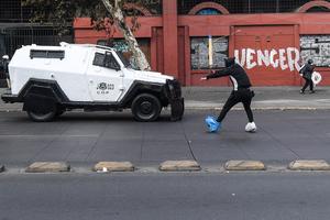 (250501) -- SANTIAGO, 1 mayo, 2025 (Xinhua) -- Un manifestante se enfrenta con un vehículo de la policía antimotines durante la marcha denominada "1 de Mayo Clasista" en el marco de la conmemoración del Día Internacional del Trabajo, en Santiago, capital de Chile, el 1 de mayo de 2025. (Xinhua/Jorge Villegas) (jv) (da) (ra) (ce)
