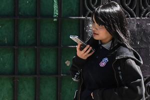(260327) -- SANTIAGO, 27 marzo, 2026 (Xinhua) -- Imagen del 23 de marzo de 2026 de una estudiante hablando por su teléfono móvil mientras camina por una calle, en Santiago, capital de Chile. En Chile arrancó la regulación de dispositivos móviles en los colegios, en especial los celulares, una medida que busca recuperar la concentración y el vínculo humano en las aulas, lo que para expertos es una oportunidad para orientar su uso correcto en niños y adolescentes. (Xinhua/Jorge Villegas) (jv) (rtg) (ra) (vf)