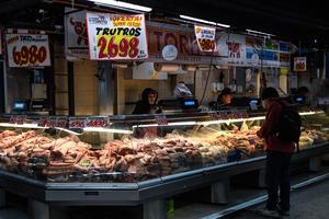 (250611) -- SANTIAGO, 11 junio, 2025 (Xinhua) -- Una persona realiza compras en una carnicería en el mercado La Vega Central, en Santiago, capital de Chile, el 11 de junio de 2025. Analistas del mercado chileno elevaron a 2,2 por ciento su proyección de crecimiento de la economía del país sudamericano este año, tras estimar un 2 por ciento el mes anterior, informó el martes el Banco Central de Chile. (Xinhua/Jorge Villegas) (jv) (jg) (da) (ce)