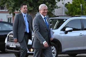 (251203) — SANTIAGO, 3 diciembre, 2025 (Xinhua) — El candidato a la Presidencia chilena, líder de la ultraderecha local, José Antonio Kast (frente), llega para participar en el debate presidencial organizado por la Asociación de Radiodifusoras de Chile, en Santiago, capital de Chile, el 3 de diciembre de 2025. Con promesas para regular la emigración ilegal y fuertes anuncios económicos concluyó el penúltimo debate presidencial entre el ultraderechista, José Antonio Kast, y la izquierdista, Jeannette Jara, a 11 días de la segunda vuelta electoral para elegir en Chile a un nuevo jefe de Estado. (Xinhua/Jorge Villegas) (jv) (jg) (da) (vf)