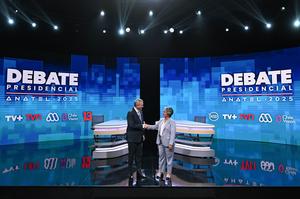 (251210) -- SANTIAGO, 10 diciembre, 2025 (Xinhua) -- Imagen del 9 de diciembre de 2025 del candidato a la Presidencia chilena, líder de la ultraderecha local, José Antonio Kast (i), y la candidata a la Presidencia chilena, abanderada de la izquierda y el oficialismo, Jeannette Jara (d), estrechando las manos previo al debate presidencial organizado por la Asociación Nacional de Televisión de Chile, en Santiago, capital de Chile. Durante el último debate presidencial en Chile entre la candidata izquierdista Jeannette Jara y el ultraderechista José Antonio Kast, llevado a cabo la noche del martes, los postulantes marcaron sus diferencias en material de seguridad y prometieron fuertes medidas para paliar la inmigración ilegal, además de anunciar que renunciarían a sus respectivos partidos, en caso de resultar electos el próximo domingo 14 de diciembre en la segunda vuelta electoral. (Xinhua/Jorge Villegas) (jv) (jg) (da) (vf)