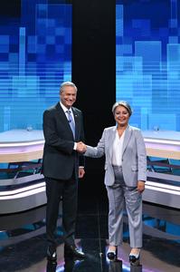 (251210) -- SANTIAGO, 10 diciembre, 2025 (Xinhua) -- Imagen del 9 de diciembre de 2025 del candidato a la Presidencia chilena, líder de la ultraderecha local, José Antonio Kast (i), y la candidata a la Presidencia chilena, abanderada de la izquierda y el oficialismo, Jeannette Jara (d), estrechando las manos previo al debate presidencial organizado por la Asociación Nacional de Televisión de Chile, en Santiago, capital de Chile. Durante el último debate presidencial en Chile entre la candidata izquierdista Jeannette Jara y el ultraderechista José Antonio Kast, llevado a cabo la noche del martes, los postulantes marcaron sus diferencias en material de seguridad y prometieron fuertes medidas para paliar la inmigración ilegal, además de anunciar que renunciarían a sus respectivos partidos, en caso de resultar electos el próximo domingo 14 de diciembre en la segunda vuelta electoral. (Xinhua/Jorge Villegas) (jv) (jg) (da) (vf)