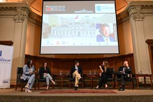 (251106) -- SANTIAGO, 6 noviembre, 2025 (Xinhua) -- Imagen del 5 de noviembre de 2025 del candidato a la Presidencia chilena, el diputado libertario, Johannes Kaiser (c), participando durante el evento Seminarios Presidenciales 2025: Propuestas para Chile 2026-2030, Conversando con Johannes Kaiser, organizado por el Centro Latinoamericano de Políticas Económicas y Sociales en el Salón de Honor de la Casa Central de la Universidad Católica de Chile, en Santiago, capital de Chile. (Xinhua/Jorge Villegas) (jv) (jg) (ah)