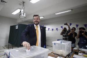 (251116) -- SANTIAGO, 16 noviembre, 2025 (Xinhua) -- Imagen cedida por la Agencia de Noticias de Chile AGENCIA UNO del candidato a la Presidencia chilena, el diputado libertario, Johannes Kaiser (i), emitiendo su voto durante las elecciones presidenciales en el Liceo 7 de Mujeres, en la comuna de Providencia, en la ciudad de Santiago, capital de Chile, el 16 de noviembre de 2025. Más de 15,77 millones de personas están convocadas a votar el domingo en las primeras elecciones presidenciales de Chile con participación obligatoria, en una disputa entre candidaturas de izquierda y ultraderecha como favoritas, lo que definirá el rumbo político del país para los próximos cuatro años. (Xinhua/Ernesto Guevara/AGENCIA UNO) (rtg) (ah)