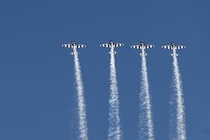 (260408) -- SANTIAGO, 8 abril, 2026 (Xinhua) -- Imagen del 7 de abril de 2026 de una presentación de acrobacias aéreas llevada a cabo durante la Feria Internacional del Aire y del Espacio (FIDAE), en Santiago, Chile. La FIDAE de este año, programada del 7 al 12 de abril, ha atraído a 440 expositores de 35 países y regiones, incluida China. (Xinhua/Jorge Villegas) (ah) (ra) (ce)