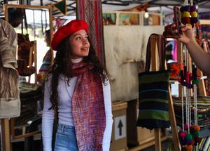 (260426) -- SANTIAGO, 26 abril, 2026 (Xinhua) -- Imagen del 25 de abril de 2026 de una mujer probándose un gorro de lana en un festival de lana, en Santiago, Chile. (Xinhua/Zhou Jiayi) (da) (ah) (ce)