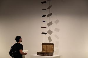 (250828) -- SANTIAGO, 28 agosto, 2025 (Xinhua) -- Imagen del 26 de agosto de 2025 de una persona observando una obra en la muestra chilena "Ida y Vuelta", en el Centro de Extensión de la Pontificia Universidad Católica de Chile, en Santiago, capital de Chile. Numerosos viajes convertidos en poemas, bitácoras, fotografías y otras expresiones artísticas son exploradas en la muestra chilena "Ida y Vuelta", en el marco del 7° Festival de Libros, que se lleva a cabo en la capital Santiago hasta el 30 de septiembre próximo. (Xinhua/Jorge Villegas) (jv) (jg) (ah) (ce)