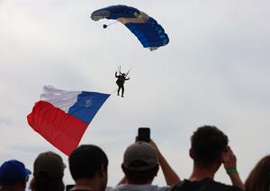 (260413) -- SANTIAGO, 13 abril, 2026 (Xinhua) -- Imagen del 12 de abril de 2026 de personas observando una presentación de paracaidismo en la Feria Internacional del Aire y del Espacio (FIDAE) 2026, en Santiago, capital de Chile. La FIDAE 2026 finalizó aquí el domingo. (Xinhua/Zhou Jiayi) (oa) (ah) (ce)