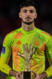 (251020) -- SANTIAGO, 20 octubre, 2025 (Xinhua) -- Imagen del 19 de octubre de 2025 de Santino Barbi, de Argentina, recibiendo el Guante de Oro al término del partido final entre Argentina y Marruecos de la Copa Mundial Sub-20 de la FIFA Chile 2025, en Santiago, Chile. (Xinhua/Meng Dingbo) (oa) (ah) (ce)