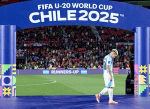 (251020) -- SANTIAGO, 20 octubre, 2025 (Xinhua) -- Imagen del 19 de octubre de 2025 de Gianluca Prestianni, de Argentina, visto durante la ceremonia de premiación al término del partido final entre Argentina y Marruecos de la Copa Mundial Sub-20 de la FIFA Chile 2025, en Santiago, Chile. (Xinhua/Meng Dingbo) (oa) (ah) (ce)