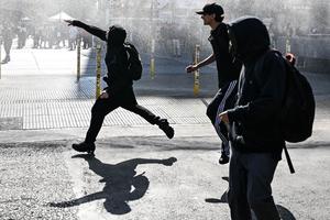 (260429) -- SANTIAGO, 29 abril, 2026 (Xinhua) -- Estudiantes se enfrentan con la policía antimotines durante una manifestación, en Santiago, capital de Chile, el 29 de abril 2026. (Xinhua/Jorge Villegas) (jv) (da) (ra) (vf)