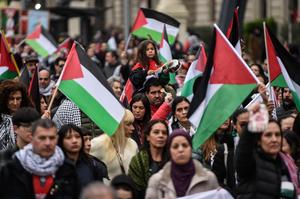 (250809) -- SANTIAGO, 9 agosto, 2025 (Xinhua) -- Personas participan en "La Marcha de Las Ollas Vacías" convocada por la Comunidad Palestina de Chile, en Santiago, capital de Chile, el 9 de agosto de 2025. (Xinhua/Jorge Villegas) (jv) (jg) (da)