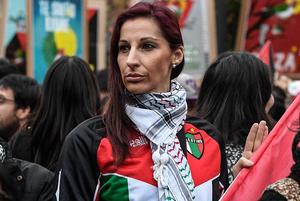 (250615) -- SANTIAGO,15 junio, 2025 (Xinhua) -- Imagen del 14 de junio de 2025 de una palestina residente en Chile participando en la Marcha Mundial a Gaza, en Santiago, capital de Chile. (Xinhua/Jorge Villegas) (jv) (rtg) (da)