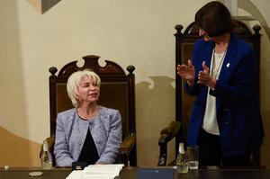 (250923) -- SANTIAGO, 23 septiembre, 2025 (Xinhua) -- La escritora, Isabel Allende (i), reacciona junto a la rectora de la Universidad de Chile, Rosa Devés Alessandri (d), durante la ceremonia de entrega de la Medalla Rectoral, en el Salón de Honor de la Casa Central de la Universidad de Chile, en Santiago, capital de Chile, el 23 de septiembre de 2025. (Xinhua/Jorge Villegas) (jv) (jg) (ra) (ce)