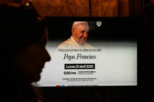 (250421) -- SANTIAGO, 21 abril, 2025 (Xinhua) -- Una mujer participa en una misa en homenaje al papa Francisco, en la Catedral Metropolitana, en Santiago, capital de Chile, el 21 de abril de 2025. El papa Francisco, nacido Jorge Mario Bergoglio, falleció el lunes a los 88 años de edad, anunció el Vaticano en un comunicado. El 266º pontífice de la Iglesia católica romana nació el 17 de diciembre de 1936 en Buenos Aires, Argentina, y asumió el pontificado en 2013. (Xinhua/Jorge Villegas) (jv) (rtg) (ah) (ce)