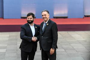(250721) -- SANTIAGO, 21 julio, 2025 (Xinhua) -- El presidente chileno, Gabriel Boric (i) , recibe al presidente uruguayo, Yamandú Orsi (d), durante la Reunión de Alto Nivel "Democracia Siempre", en el Palacio de La Moneda, en Santiago, capital de Chile, el 21 de julio de 2025. (Xinhua/Jorge Villegas) (jv) (rtg) (ah) (ce)