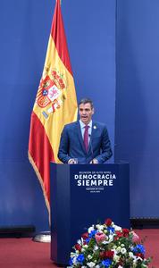 (250721) -- SANTIAGO, 21 julio, 2025 (Xinhua) -- El presidente del Gobierno español, Pedro Sánchez, participa durante una declaración conjunta ante los medios de comunicación después de la Reunión de Alto Nivel "Democracia Siempre", en el Palacio de La Moneda, en Santiago, capital de Chile, el 21 de julio de 2025. Los jefes de Estado y de Gobierno de España, Brasil, Colombia, Uruguay y Chile se comprometieron el lunes por la defensa de la democracia, el multilateralismo y el trabajo conjunto para abordar las causas profundas y estructurales que "socavan nuestras instituciones democráticas, sus valores y legitimidad". (Xinhua/Jorge Villegas) (jv) (rtg) (ah) (vf)