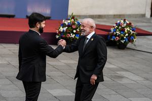 (250721) -- SANTIAGO, 21 julio, 2025 (Xinhua) -- El presidente chileno, Gabriel Boric (i) , recibe al presidente brasileño, Luiz Inácio Lula da Silva (d), durante la Reunión de Alto Nivel "Democracia Siempre", en el Palacio de La Moneda, en Santiago, capital de Chile, el 21 de julio de 2025. (Xinhua/Jorge Villegas) (jv) (rtg) (ah) (ce)