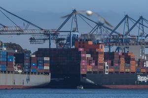 (250225) -- VALPARAISO, 25 febrero, 2025 (Xinhua) -- Imagen del 21 de febrero de 2025 de buques cargados con contenedores vistos en el Puerto de Valparaíso, en la ciudad de Valparaíso, Chile. Chile ha exportado durante la presente temporada un 51 por ciento más de cerezas respecto al período estival anterior, gracias a una mayor producción de la fruta a nivel nacional y el impulso de China como principal destino, señaló la asociación gremial frutícola, Frutas de Chile. (Xinhua/ Jorge Villegas) (jv) (oa) (ah) (vf)