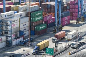 (250225) -- VALPARAISO, 25 febrero, 2025 (Xinhua) -- Imagen del 21 de febrero de 2025 de camiones transportando contenedores en el Puerto de Valparaíso, en la ciudad de Valparaíso, Chile. Chile ha exportado durante la presente temporada un 51 por ciento más de cerezas respecto al período estival anterior, gracias a una mayor producción de la fruta a nivel nacional y el impulso de China como principal destino, señaló la asociación gremial frutícola, Frutas de Chile. (Xinhua/ Jorge Villegas) (jv) (oa) (ah) (vf)