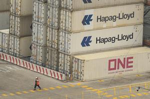 (250321) -- VALPARAISO, 21 marzo, 2025 (Xinhua) -- Un trabajador portuario camina frente a contenedores apilados en el Puerto de Valparaíso, en la ciudad de Valparaíso, Chile, el 21 de marzo de 2025. El presidente de Chile, Gabriel Boric, destacó el miércoles el crecimiento económico del país registrado en 2024 a partir del informe difundido el martes por el Banco Central. (Xinhua/Jorge Villegas) (jv) (jg) (da) (vf)
