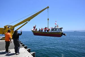 (251224) -- VALPARAISO, 24 diciembre, 2025 (Xinhua) -- Una persona caracterizada como el Viejito Pascuero (Santa Claus) saluda mientras es trasladado a bordo de un bote pesquero durante un evento navideño celebrado en la Caleta Portales, en la ciudad de Valparaíso, Chile, el 24 de diciembre de 2025. (Xinhua/Jorge Villegas) (jv) (ah) (ra) (vf)