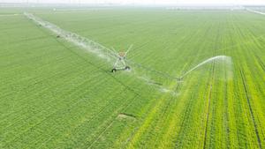 (250410) -- BEIJING, 10 abril, 2025 (Xinhua) -- Vista aérea tomada con un dron el 9 de abril de 2025 de un aspersor regando las cosechas en un campo, en Dongying, en la provincia de Shandong, en el este de China. (Xinhua/Liu Yunjie) (rtg) (ra) (vf)