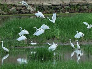 (250811) -- BEIJING, Aug. 11, 2025 (Xinhua) -- Yellow-billed egrets and herons rest and forage at the waters of a wetland in Rongcheng City, east China's Shandong Province, on Aug. 11, 2025. (Photo by Li Xinjun/Xinhua)