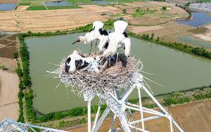 (250521) -- HEFEI, 21 mayo, 2025 (Xinhua) -- Vista aérea tomada con un dron el 21 de mayo de 2025 de cigüeñas blancas orientales cuidando de los polluelos en lo alto de una torre de transmisión, en el distrito de Huoqiu, en la provincia de Anhui, en el este de China. A principios de mayo de este año, trabajadores descubrieron un nido de cigüeñas blancas orientales, un ave migratoria bajo protección estatal de primera clase, en la recién construida torre de transmisión. La State Grid Anhui Electric Power Co., Ltd. ha instalado cámaras de alta definición cerca del nido, ha asignado personal para rastrear y proteger a las cigüeñas blancas orientales y ha pospuesto el progreso de la construcción de acuerdo con el cronograma de reproducción de las cigüeñas. (Xinhua/Zhou Mu) (ra) (vf)