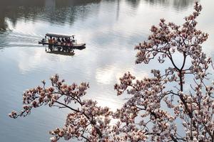 (250422) -- SHEXIAN, 22 abril, 2025 (Xinhua) -- Imagen tomada con un dron el 6 de marzo de 2025 de personas navegando en un bote turístico en el río Xin'an, en el distrito de Shexian, en la ciudad de Huangshan, en la provincia de Anhui, en el este de China. Ubicado en el cruce de las montañas Huangshan y el río Xin'an, el distrito de Shexian, en la provincia de Anhui, en el este de China, ha conservado la esencia de la cultura y la arquitectura de estilo hui. (Xinhua/Shi Yalei) (oa) (ah) (ce)