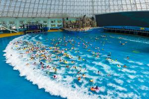 (250830) — HEFEI, 30 agosto, 2025 (Xinhua) — Imagen tomada con un dron el 3 de agosto de 2025 de personas jugando en una instalación de deportes acuáticos, en el distrito de Nanling, en la ciudad de Wuhu, en la provincia de Anhui, en el este de China. Durante las vacaciones de verano, las ciudades de la provincia de Anhui han aprovechado sus abundantes recursos montañosos e hídricos para desarrollar una «economía de refrescamiento», atrayendo a un gran número de visitantes. (Xinhua/Xiao Benxiang) (oa) (da)