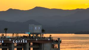 (250830) -- HEFEI, 30 agosto, 2025 (Xinhua) -- Imagen tomada con un dron el 28 de agosto de 2025 de visitantes disfrutando del atardecer en un centro de deportes acuáticos, en la ciudad de Huangshan, en la provincia de Anhui, en el este de China. Durante las vacaciones de verano, las ciudades de la provincia de Anhui han aprovechado sus abundantes recursos montañosos e hídricos para desarrollar una "economía de refrescamiento", atrayendo a un gran número de visitantes. (Xinhua/Zhou Mu) (oa) (da)