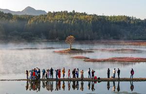 (251114) -- HUANGSHAN, 14 noviembre, 2025 (Xinhua) -- Imagen tomada con dron de turistas disfrutando del paisaje del lago Qishu, en el distrito de Yixian, en la provincia de Anhui, en el este de China, el 14 de noviembre de 2025. (Xinhua/Shi Yalei) (oa) (da)