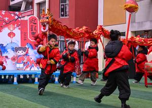 (260101) -- BEIJING, 1 enero, 2026 (Xinhua) -- Imagen del 31 de diciembre de 2025 de niños realizando una presentación de una danza del dragón en un jardín de niños, en el distrito de Xiayi de la ciudad de Shangqiu, en la provincia de Henan, en el centro de China. Diversas actividades se llevaron a cabo en toda China para celebrar el Año Nuevo. (Xinhua/Miao Yucai) (da) (ra) (vf)