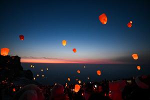 (260101) -- BEIJING, 1 enero, 2026 (Xinhua) -- Personas liberan linternas Kongming electrónicas al amanecer en un área escénica de la montaña Helan, en Yinchuan, en la región autónoma hui de Ningxia, en el noroeste de China, el 1 de enero de 2026. Personas a lo largo de China reciben la llegada de 2026 al amanecer. (Xinhua/Feng Kaihua) (da) (ra) (vf)