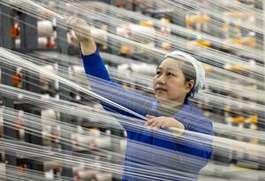 (260104) -- BEIJING, 4 enero, 2026 (Xinhua) -- Una trabajadora opera en el taller de una empresa textil, en Taizhou, en la provincia de Jiangsu, en el este de China, el 4 de enero de 2026. (XinhTang Dehong) (oa) (ah) (ce)