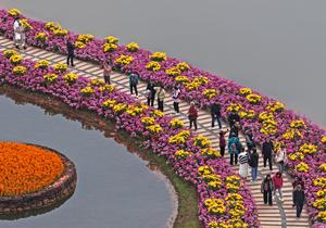 (260103) -- BEIJING, 3 enero, 2026 (Xinhua) -- Vista aérea tomada con un dron el 3 de enero de 2026 de turistas observando flores de crisantemo en un área escénica, en Nanning, en la región autónoma de la etnia zhuang de Guangxi, en el sur de China. Las personas participaron en diversas actividades de ocio durante las vacaciones de Día de Año Nuevo. (Xinhua/Zhou Hua) (jg) (oa) (ra) (ce)