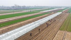 (260325) -- BEIJING, 25 marzo, 2025 (Xinhua) -- Vista aérea tomada con un dron el 25 de marzo de 2026 de agricultores trabajando en un campo de jengibre, en el poblado de Nanqiao del distrito de Xingtang, en Shijiazhuang de la provincia de Hebei, en el norte de China. Agricultores de toda China han estado recientemente ocupados con el arado de primavera. (Xinhua/Liang Zidong) (ah) (ra) (vf)