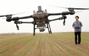 (250315) -- BEIJING, 15 marzo, 2025 (Xinhua) -- Imagen del 14 de marzo de 2025 de un agricultor operando un dron para rociar pesticidas en un campo, en la aldea de Zhaozhuangzi, en la ciudad de Cangzhou de la provincia de Hebei, en el norte de China. Diversas tecnologías modernas están siendo usadas durante las labores agrícolas de arado de primavera en todo el país. (Xinhua/Zhou Yang) (jg) (da)