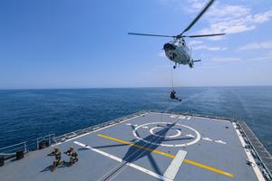 (250124) -- GUANGZHOU, 24 enero, 2025 (Xinhua) -- Imagen del 26 de octubre de 2024 de soldados de la 46ª flota de la Armada del Ejército Popular de Liberación de China participando en un entrenamiento de abordaje de buque. Una flota de la Armada china regresó el viernes a un puerto militar en la ciudad costera de Zhanjiang, en la provincia de Guangdong, en el sur de China, tras completar misiones de escolta y ejercicios conjuntos. La 46ª flota de la Armada del Ejército Popular de Liberación de China, que partió el 21 de febrero de 2024 desde Zhanjiang, recorrió más de 160.000 millas náuticas durante su viaje de 339 días, escoltando barcos durante misiones en el golfo de Adén y en aguas de Somalia. (Xinhua/Liang Lei) (oa) (ra) (vf)
