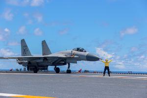 (250630) -- BEIJING, 30 junio, 2025 (Xinhua) -- Imagen de un avión de combate preparándose para despegar de un portaaviones. Dos formaciones de portaaviones chinos, el Liaoning y el Shandong, han completado su entrenamiento orientado al combate en alta mar y han regresado a salvo a sus puertos de origen, informó el lunes la Armada china. (Xinhua/Hu Xiushuai) (oa) (rtg) (vf)