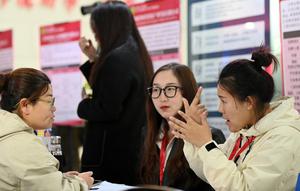 (250326) -- TIANJIN, 26 marzo, 2025 (Xinhua) -- Una reclutadora se comunica con una solicitante de trabajo en lenguaje de señas durante una feria de empleo, en Tianjin, en el norte de China, el 26 de marzo de 2025. Una feria de empleo para personas con discapacidad que se graduaron de la educación superior se celebró el miércoles en Tianjin, ofreciendo más de 100 puestos a los solicitantes de trabajo. (Xinhua/Zhao Zishuo) (ah) (ra) (vf)