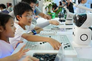 (250913) -- BEIJING, 13 septiembre, 2025 (Xinhua) -- Niños juegan al Go con robots en el área de exposición de Servicios Culturales y Turísticos de la Feria Internacional de Comercio de Servicios de China (CIFTIS, por sus siglas en inglés) 2025, en el Parque Shougang, en Beijing, capital de China, el 13 de septiembre de 2025. En la CIFTIS 2025, una variedad de tecnologías de vanguardia han enriquecido la exposición, proporcionando experiencias culturales y turísticas más interactivas e inmersivas para los visitantes. (Xinhua/Zhou Tinglu) (jg) (da)