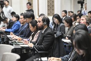 (251024) -- BEIJING, 24 octubre, 2025 (Xinhua) -- Periodistas trabajan en una conferencia de prensa celebrada por el Comité Central del Partido Comunista de China (PCCh) sobre los principios rectores de la cuarta sesión plenaria del XX Comité Central del PCCh, el 24 de octubre de 2025. (Xinhua/Jin Liangkuai) (jg) (da) (ce)