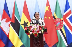 (251013) -- BEIJING, 13 octubre, 2025 (Xinhua) -- La presidenta de la Mancomunidad de Dominica, Sylvanie Burton, pronuncia un discurso durante la ceremonia de apertura de la Conferencia de Líderes Mundiales sobre la Mujer, en Beijing, capital de China, el 13 de octubre de 2025. (Xinhua/Huang Jingwen) (rtg) (ah) (vf)
