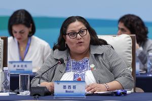 (251013) -- BEIJING, 13 octubre, 2025 (Xinhua) -- Citlalli Hernández Mora, secretaria de las Mujeres de México, asiste a la reunión plenaria de la Conferencia de Líderes Mundiales sobre la Mujer, en Beijing, capital de China, el 13 de octubre de 2025. (Xinhua/Zhang Yuwei) (rtg) (ah) (ce)